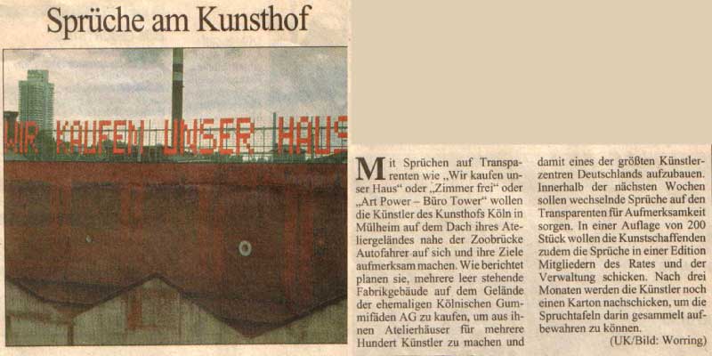Natürlich ist der „Kunsthof“ eine unterstützenswerte Gründungsinitiative, deren innovatives, in sich schlüssiges Konzept an sich schon eine Vorlage für ein kulturelles Gründerzentrum sein könnte. Aber durch den Verkauf der Grundstücke an die Stadtsparkasse und die Nichteinhaltung von Finanzierungszusagen durch die Stadt Köln ist dieses Konzept wieder in Frage gestellt. Die Stadtsparkasse will nun die Sanierung selbst durchführen und verweigert die Selbstverwaltung.